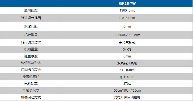 GK35-7W全自動(dòng)雙針?biāo)木€高速封包機(jī)采用雙機(jī)針縫合,一次縫兩趟線,牢固可靠,可實(shí)現(xiàn)無(wú)泄漏封包,適合于對(duì)縫口有嚴(yán)格要求的廠家對(duì)紙袋、塑編袋、布袋等的封包縫口。采用 光電開關(guān)自動(dòng)控制啟停機(jī)、電控氣動(dòng)式切刀自動(dòng)剪切線辮,適合于自動(dòng)化程度較高的化工廠、倉(cāng)庫(kù)、碼頭等流水線縫包。